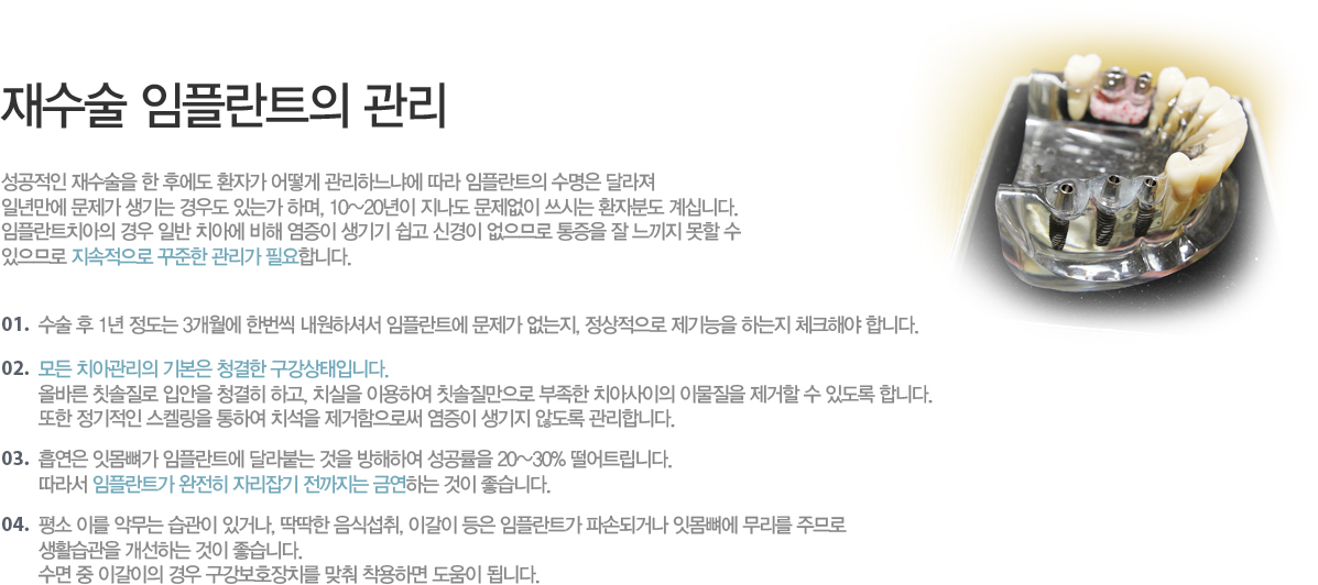 ¼º°øÀûÀÎ Àç¼ö¼úÀ» ÇÑ ÈÄ¿¡µµ ȯÀÚ°¡ ¾î¶»°Ô °ü¸®ÇÏ´À³Ä¿¡ µû¶ó ÀÓÇöõÆ®ÀÇ ¼ö¸íÀº ´Þ¶óÁ® Àϳ⸸¿¡ ¹®Á¦°¡ »ý±â´Â °æ¿ìµµ Àִ°¡ Çϸç, 10~20³âÀÌ Áö³ªµµ ¹®Á¦¾øÀÌ ¾²½Ã´Â ȯÀںеµ °è½Ê´Ï´Ù. ÀÓÇöõƮġ¾ÆÀÇ °æ¿ì ÀÏ¹Ý Ä¡¾Æ¿¡ ºñÇØ ¿°ÁõÀÌ »ý±â±â ½±°í ½Å°æÀÌ ¾øÀ¸¹Ç·Î ÅëÁõÀ» Àß ´À³¢Áö ¸øÇÒ ¼ö ÀÖÀ¸¹Ç·Î Áö¼ÓÀûÀ¸·Î ²ÙÁØÇÑ °ü¸®°¡ ÇÊ¿äÇÕ´Ï´Ù. - ¼ö¼ú ÈÄ 1³â Á¤µµ´Â 3°³¿ù¿¡ Çѹø¾¿ ³»¿øÇϼż­ ÀÓÇöõÆ®¿¡ ¹®Á¦°¡ ¾ø´ÂÁö, Á¤»óÀûÀ¸·Î Á¦±â´ÉÀ» ÇÏ´ÂÁö Ã¼Å©ÇØ¾ß ÇÕ´Ï´Ù. - ¸ðµç Ä¡¾Æ°ü¸®ÀÇ ±âº»Àº û°áÇÑ ±¸°­»óÅÂÀÔ´Ï´Ù. ¿Ã¹Ù¸¥ Ä©¼ÖÁú·Î ÀÔ¾ÈÀ» û°áÈ÷ Çϰí, Ä¡½ÇÀ» ÀÌ¿ëÇÏ¿© Ä©¼ÖÁú¸¸À¸·Î ºÎÁ·ÇÑ Ä¡¾Æ»çÀÌÀÇ À̹°ÁúÀ» Á¦°ÅÇÒ ¼ö ÀÖµµ·Ï ÇÕ´Ï´Ù. ¶ÇÇÑ Á¤±âÀûÀÎ ½ºÄ̸µÀ» ÅëÇÏ¿© Ä¡¼®À» Á¦°ÅÇÔÀ¸·Î½á ¿°ÁõÀÌ »ý±âÁö ¾Êµµ·Ï °ü¸®ÇÕ´Ï´Ù. - Èí¿¬Àº ÀÕ¸ö»À°¡ ÀÓÇöõÆ®¿¡ ´Þ¶óºÙ´Â °ÍÀ» ¹æÇØÇÏ¿© ¼º°ø·üÀ» 20~30% ¶³¾îÆ®¸³´Ï´Ù. µû¶ó¼­ ÀÓÇöõÆ®°¡ ¿ÏÀüÈ÷ ÀÚ¸®Àâ±â Àü±îÁö´Â ±Ý¿¬ÇÏ´Â °ÍÀÌ ÁÁ½À´Ï´Ù. - Æò¼Ò À̸¦ ¾Ç¹«´Â ½À°üÀÌ Àְųª, µüµüÇÑ À½½Ä¼·Ãë, À̰¥ÀÌ µîÀº ÀÓÇöõÆ®°¡ ÆÄ¼ÕµÇ°Å³ª ÀÕ¸ö»À¿¡ ¹«¸®¸¦ ÁֹǷΠ»ýȰ½À°üÀ» °³¼±ÇÏ´Â °ÍÀÌ ÁÁ½À´Ï´Ù. ¼ö¸é Áß À̰¥ÀÌÀÇ °æ¿ì ±¸°­º¸È£ÀåÄ¡¸¦ ¸ÂÃç Âø¿ëÇÏ¸é µµ¿òÀÌ µË´Ï´Ù.